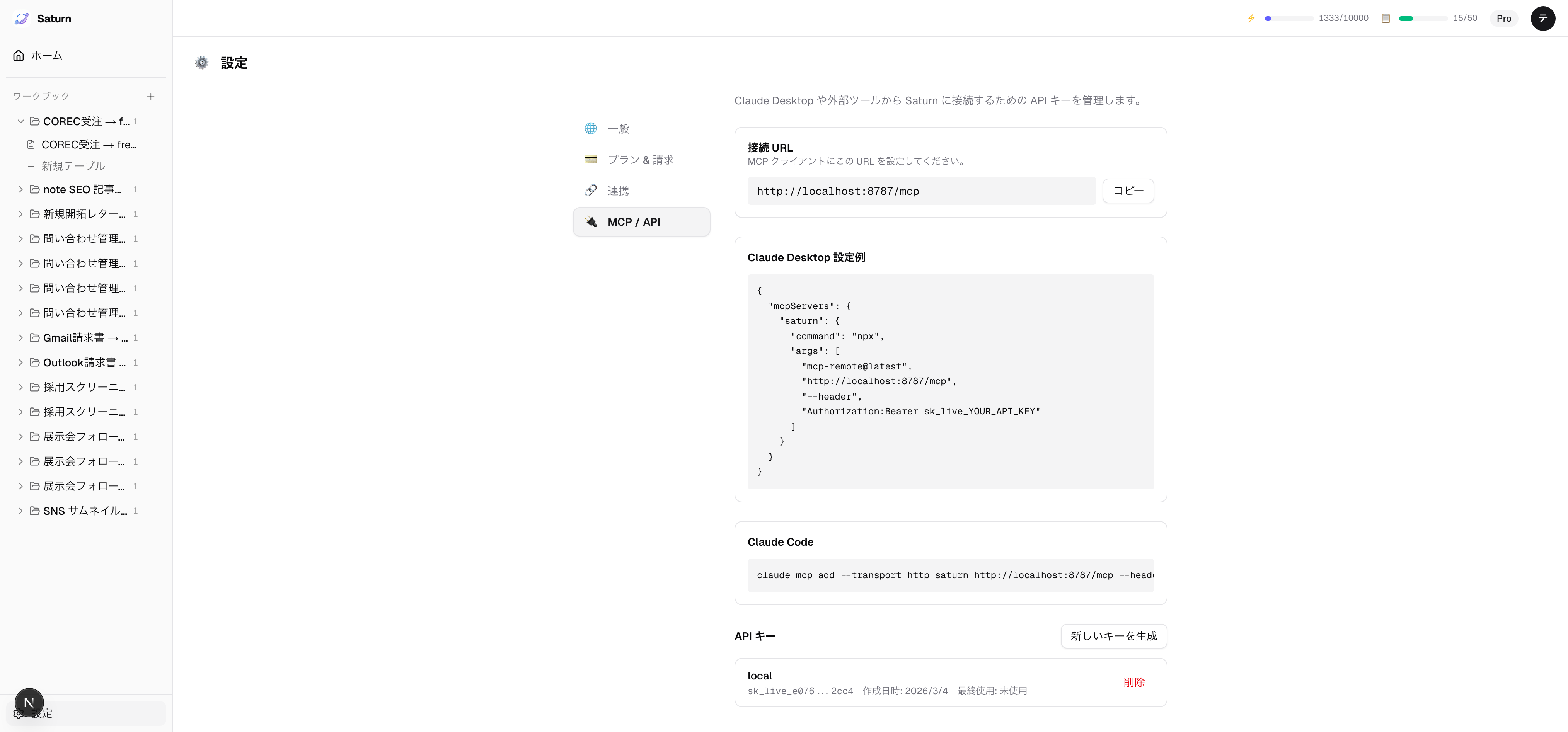 Authorization: Bearer sk_saturn_xxxxxMCP 接続での使い方は MCP(AI エージェント連携) を参照してください。