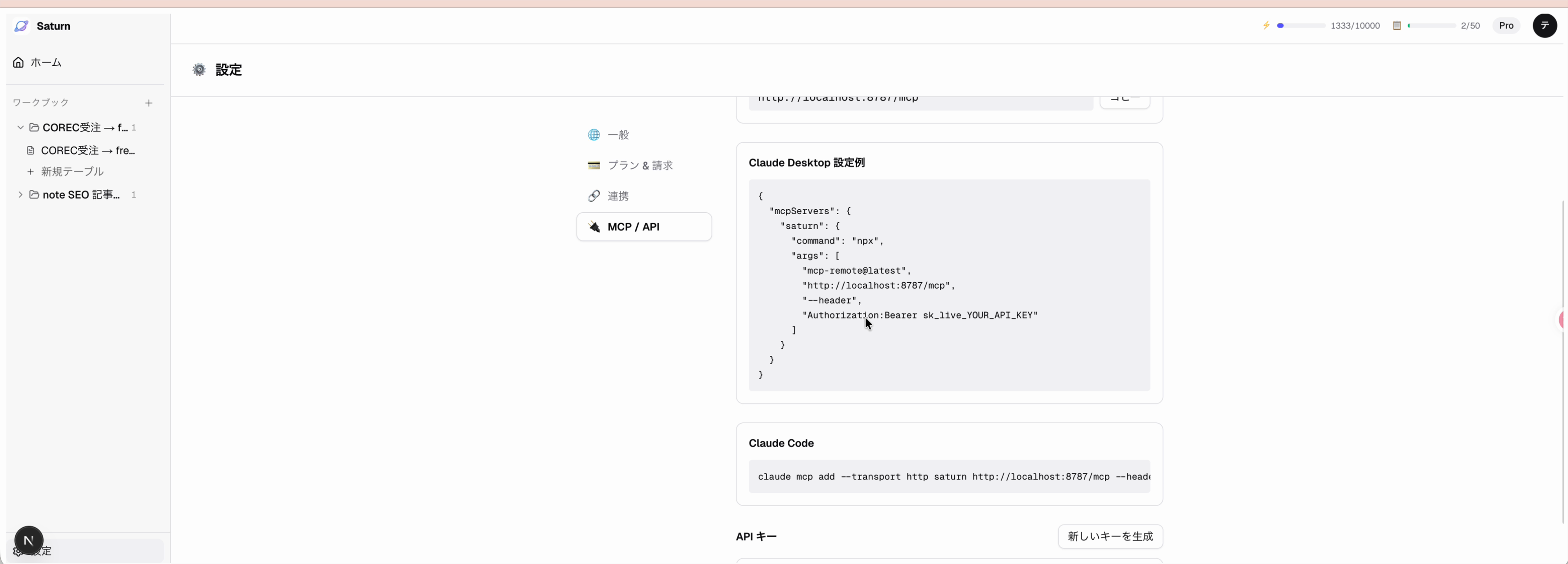 Section titled “Cline / その他の MCP クライアント”MCP クライアントの設定で、Saturn の MCP エンドポイント URL と API キーを指定してください。