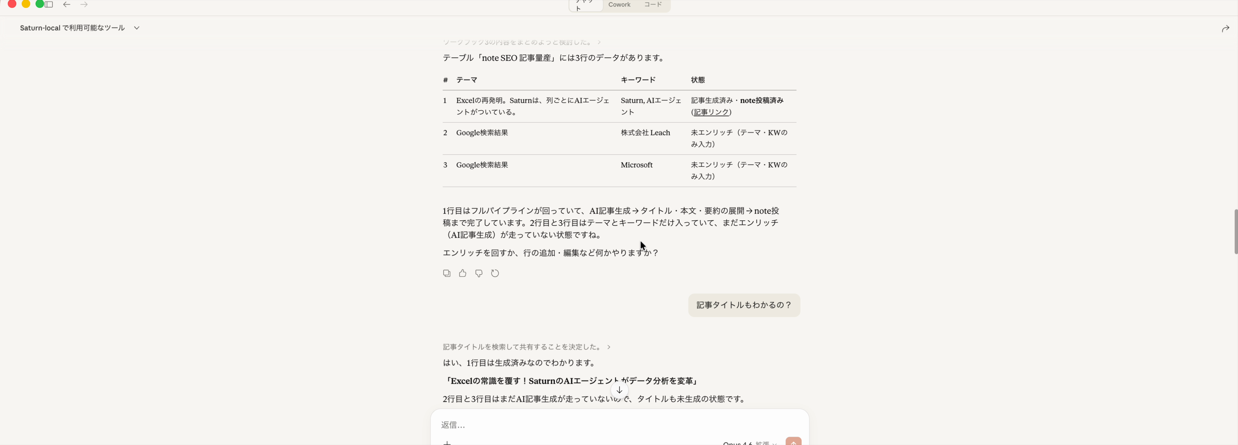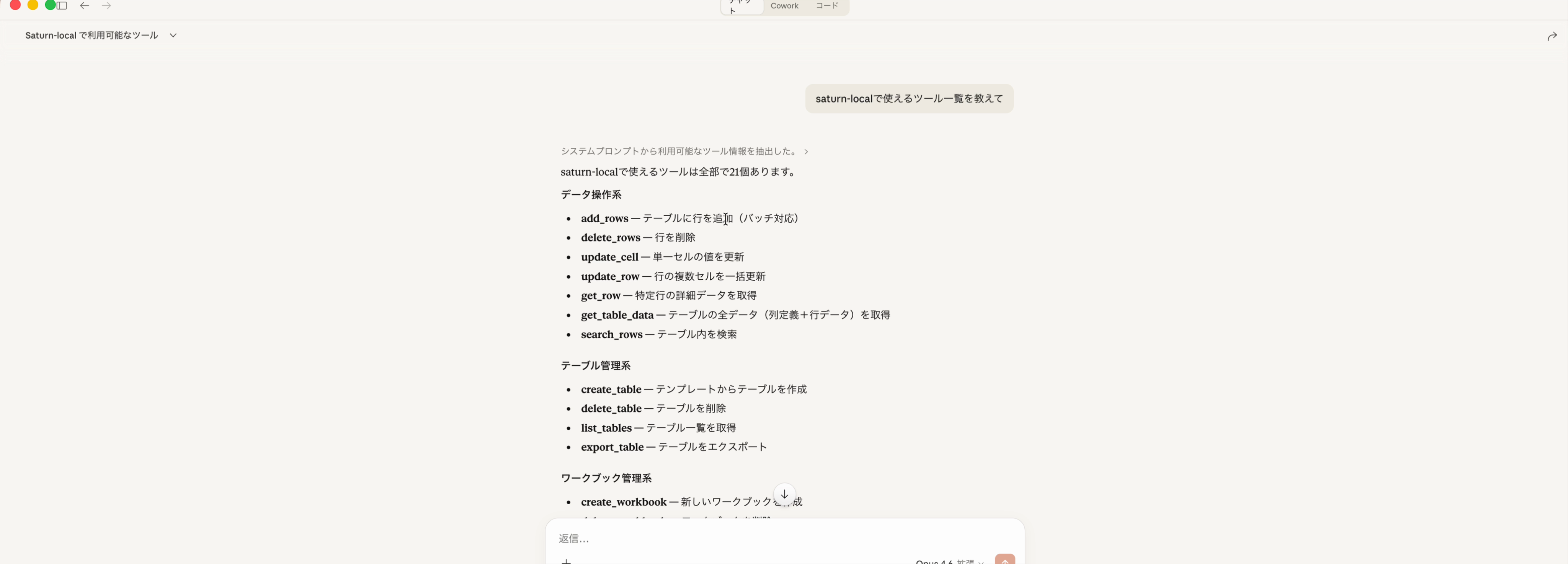 Saturn は MCP(Model Context Protocol)サーバー を内蔵しており、Claude Desktop や Cline などの AI エージェントから Saturn の全操作を実行できます。