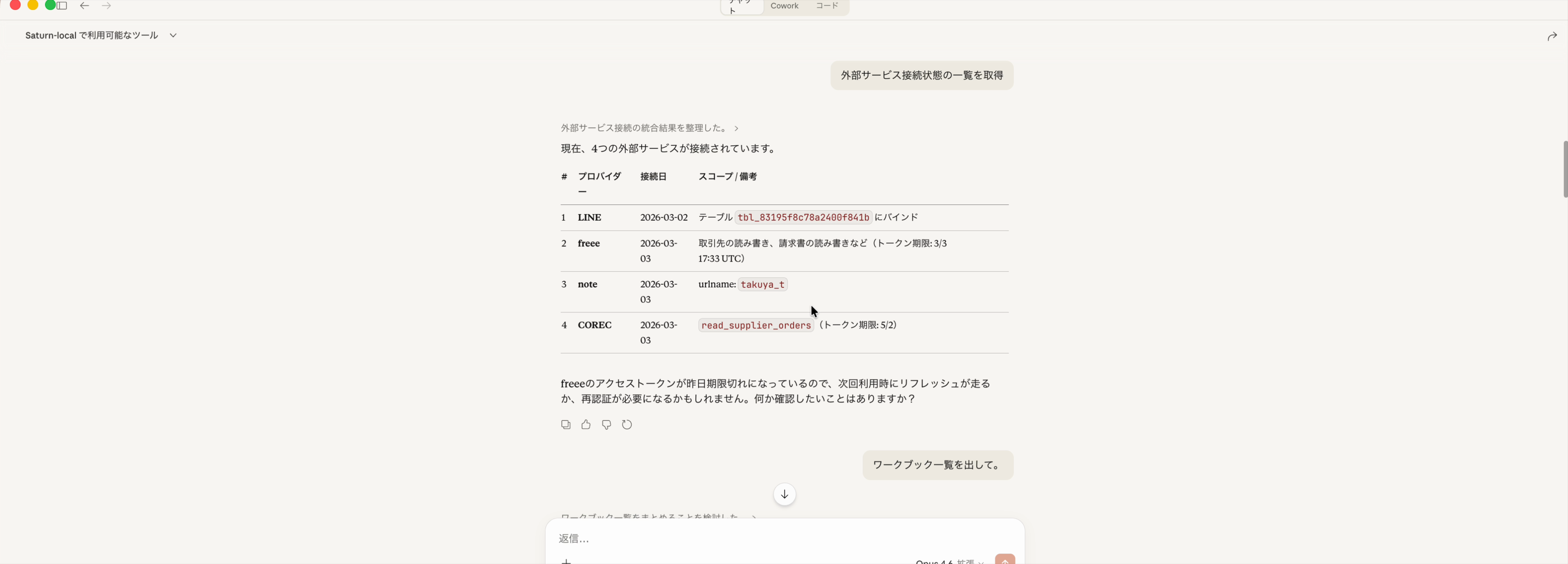 | 連携状態 | saturn://integrations | 外部サービスの接続状態 |