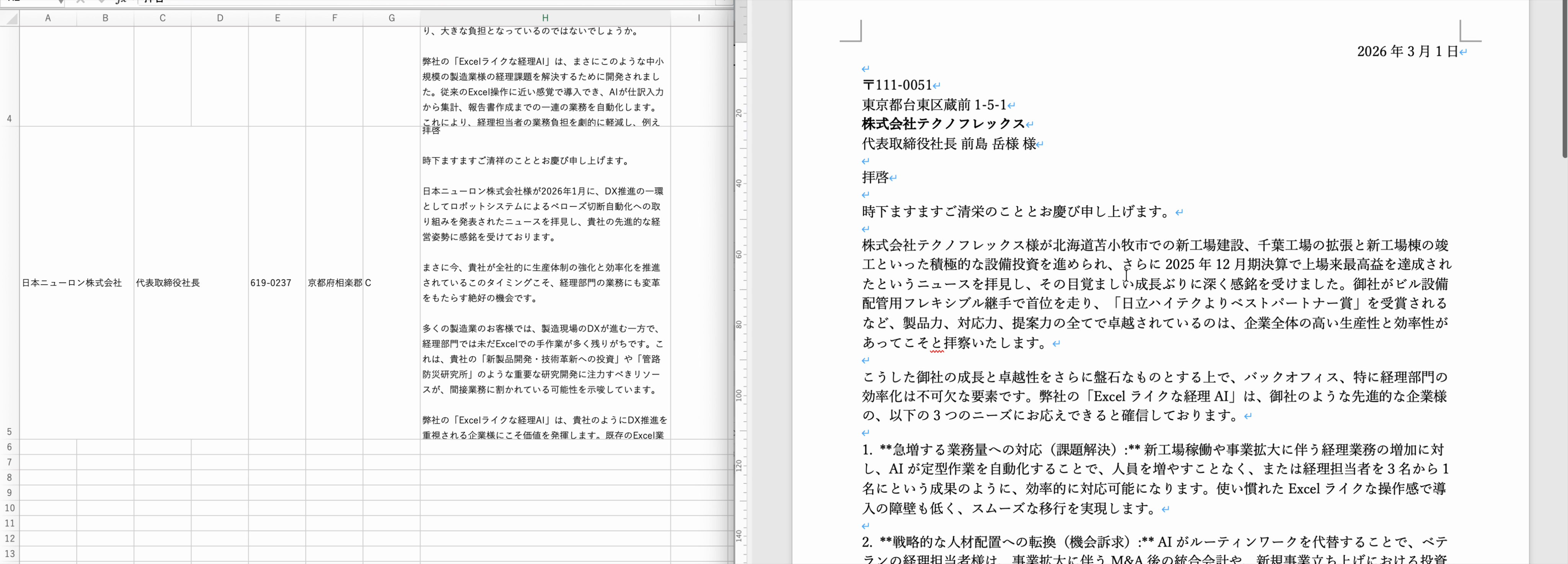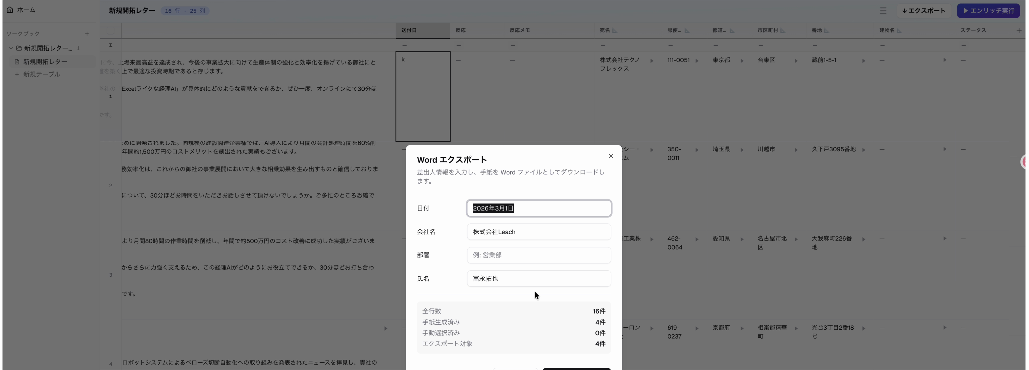新規開拓レターテンプレートで AI が生成した手紙を、宛名・住所付きの Word(DOCX)ファイルとしてダウンロードできます。印刷して封筒に入れ、そのまま郵送できます。