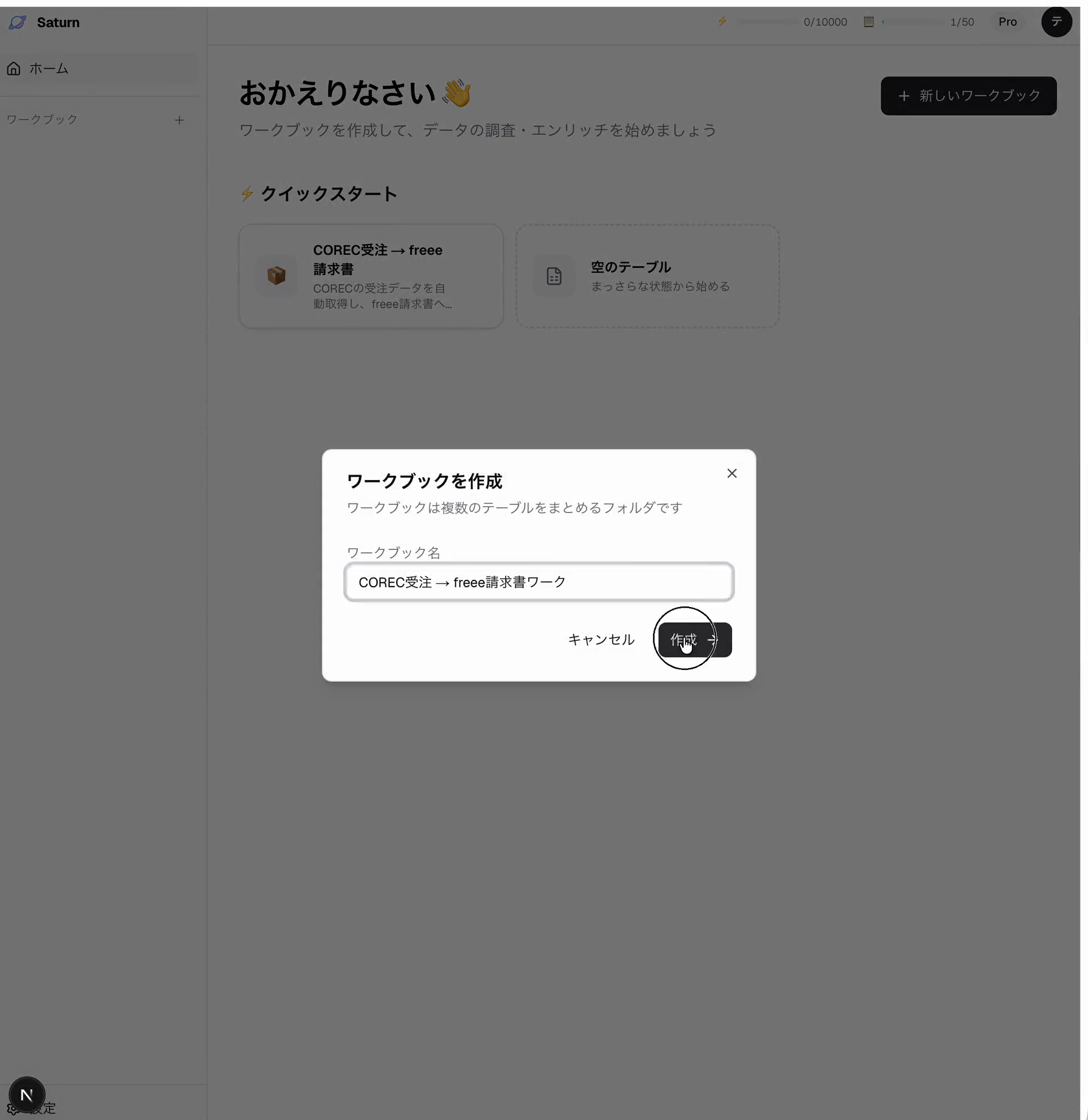 「ワークブックを作成」 ダイアログが表示される。名前を確認して 「作成 →」 を押す。