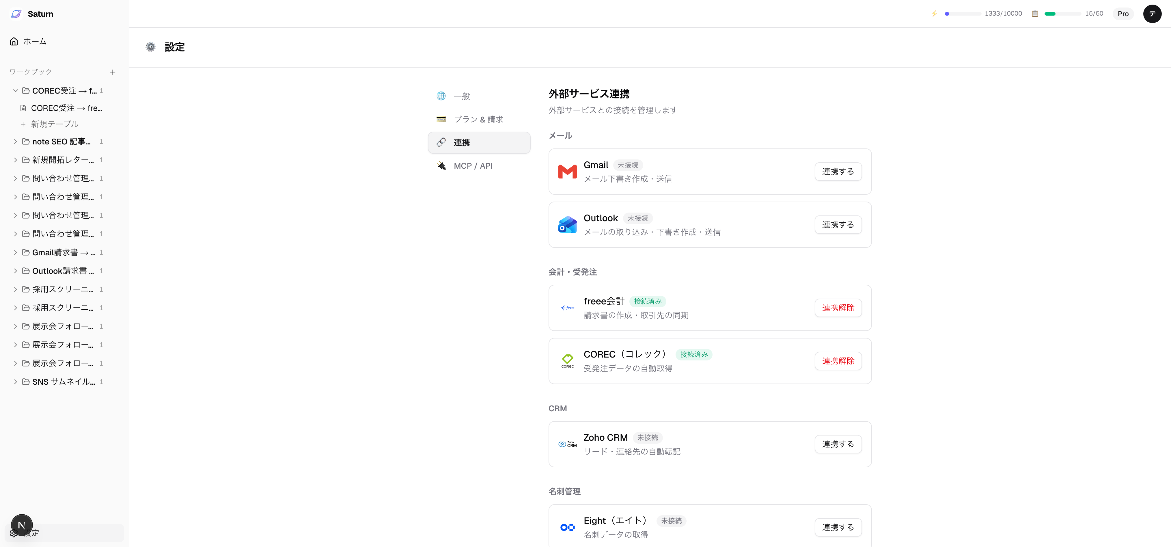 COREC を接続すると、受注データ(注文番号・受注日・取引先・金額など)を Saturn に自動取り込みできます。