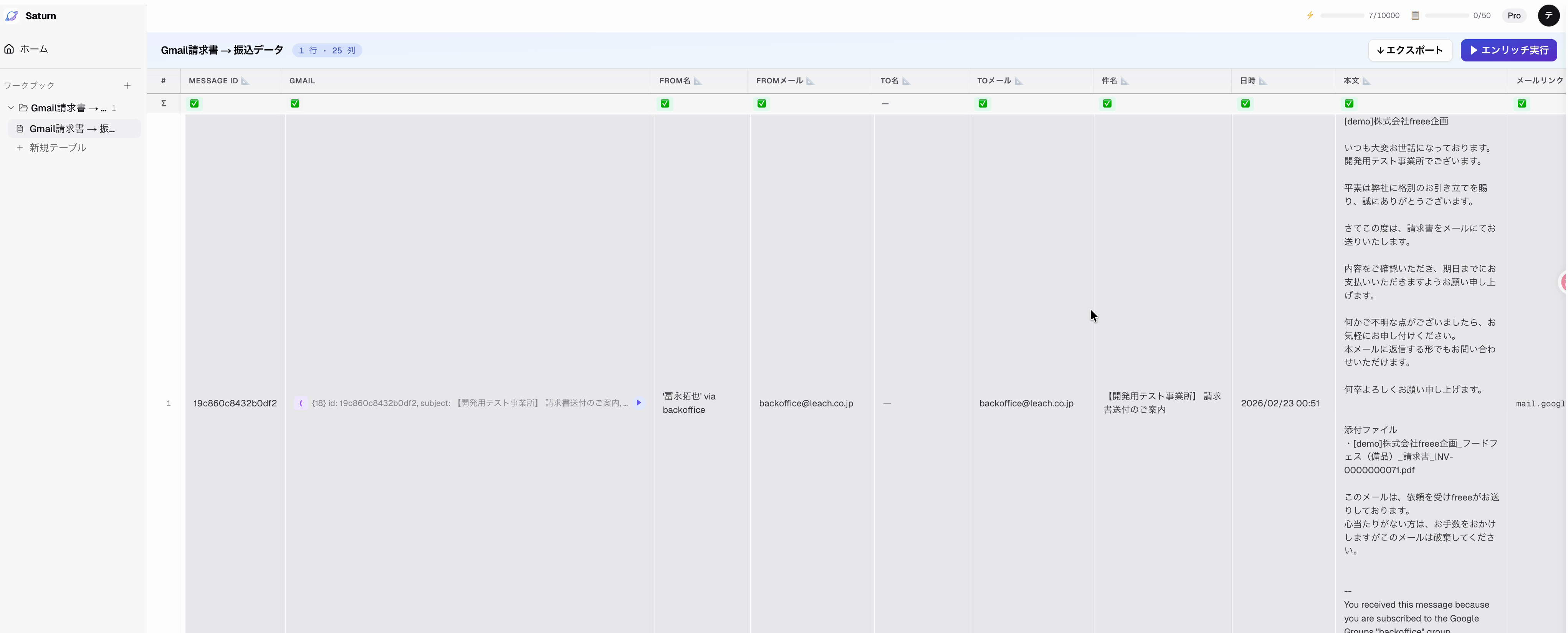 請求書メールが行として取り込まれる。添付ファイル(PDF)も自動で取得される。