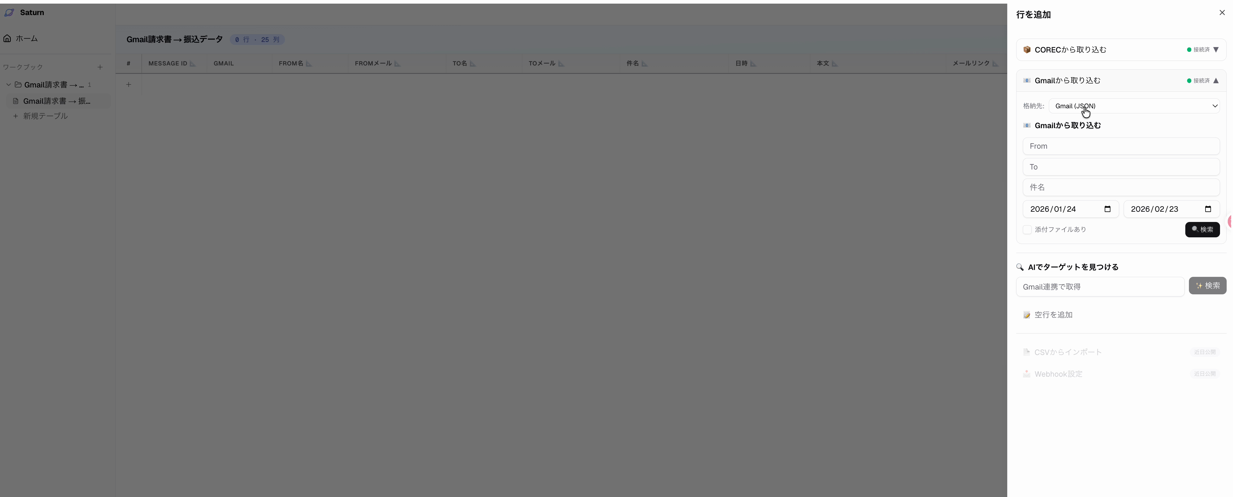 「行を追加」 パネルで 「Gmailから取り込む」 を押す。