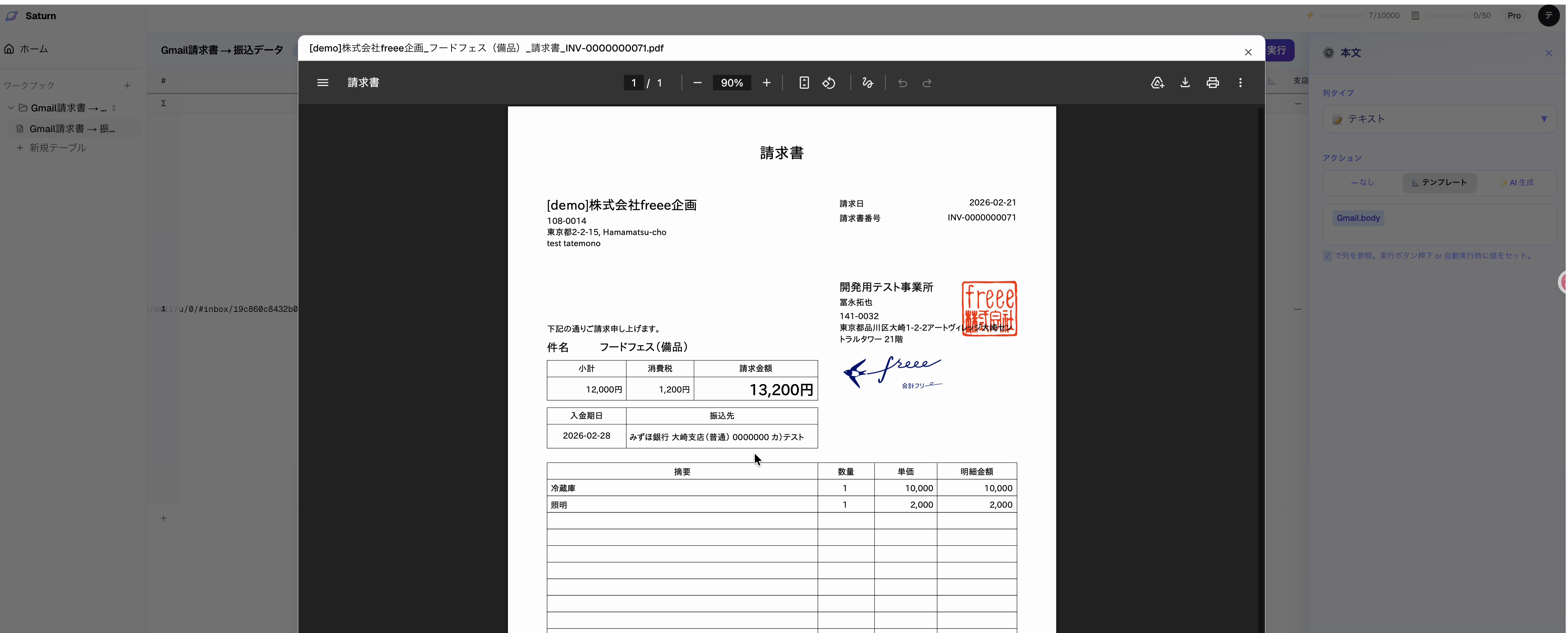 Gmail に届いた請求書メール(PDF添付)を取り込み、AI が振込先銀行・金額・期日などを自動抽出します。テーブルで内容を確認・修正したら、全銀協フォーマットでダウンロードしてネットバンキングにアップロードできます。