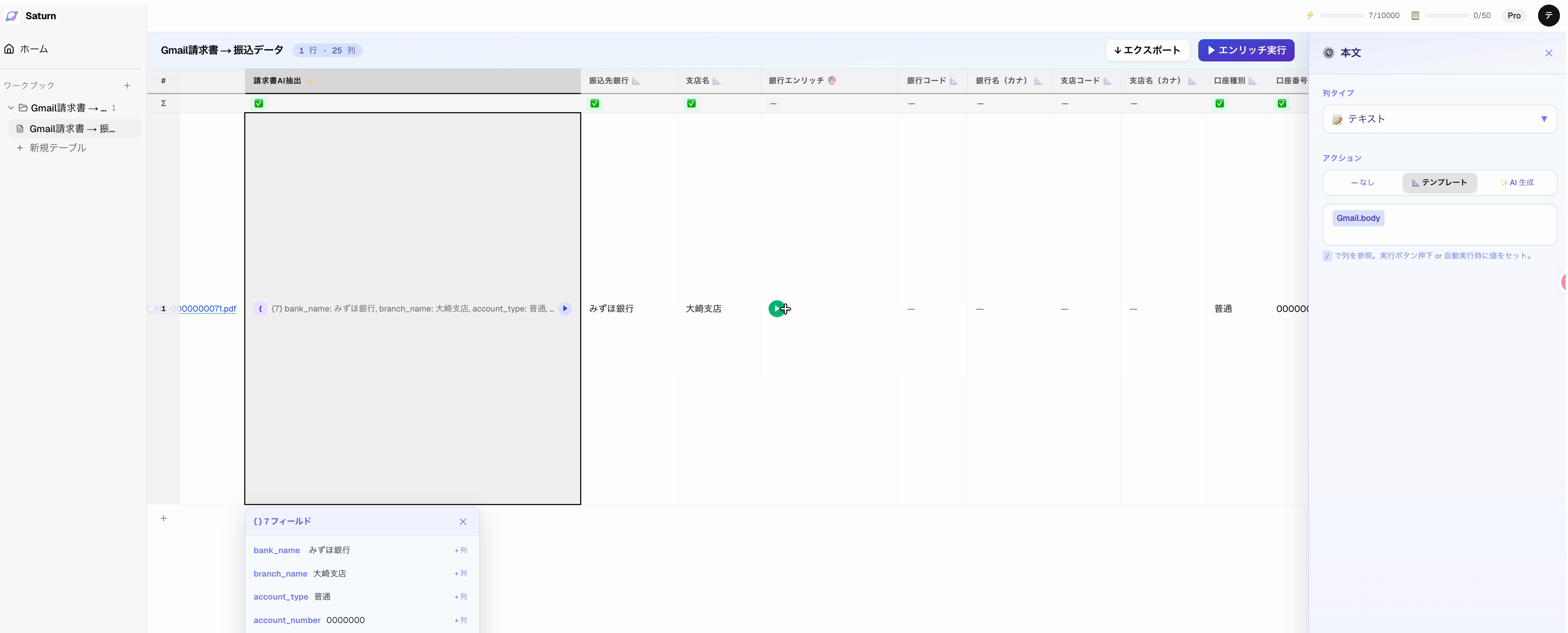 銀行エンリッチ が自動実行され、銀行名・支店名から全銀コード(4桁の銀行コード + 3桁の支店コード)が解決される。