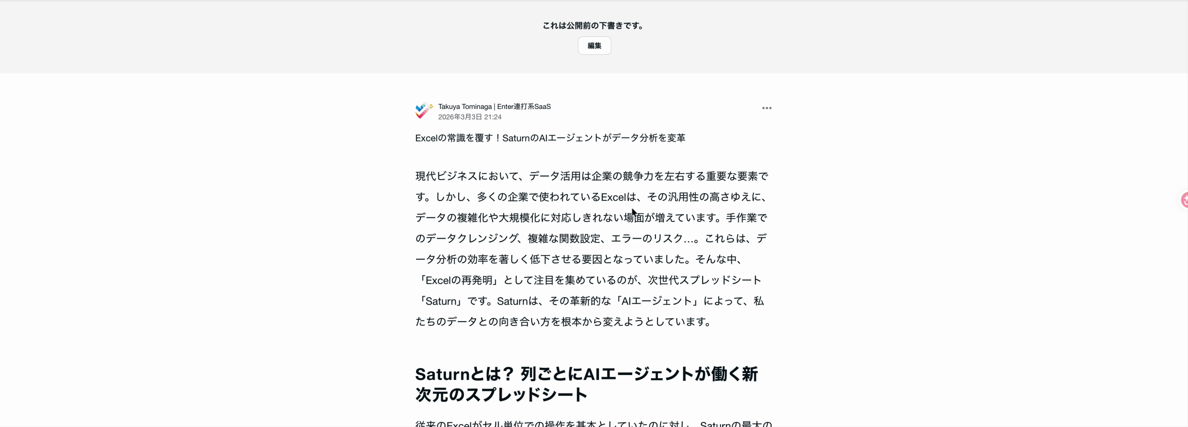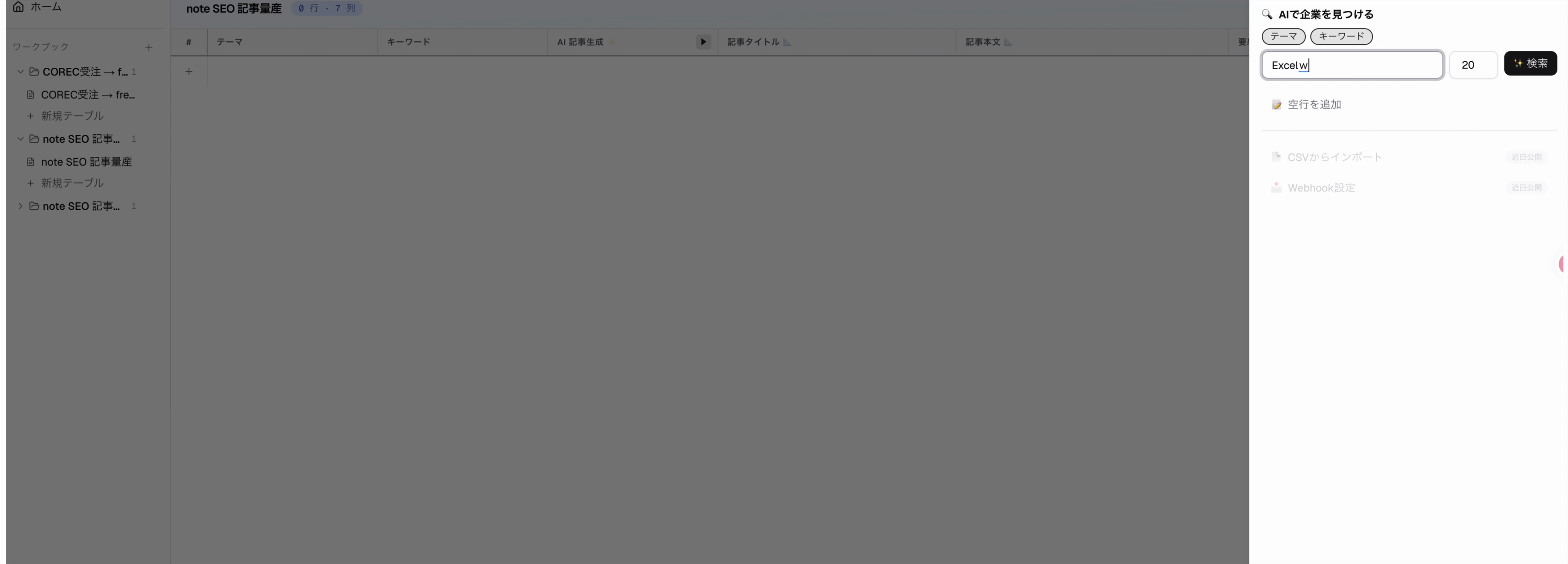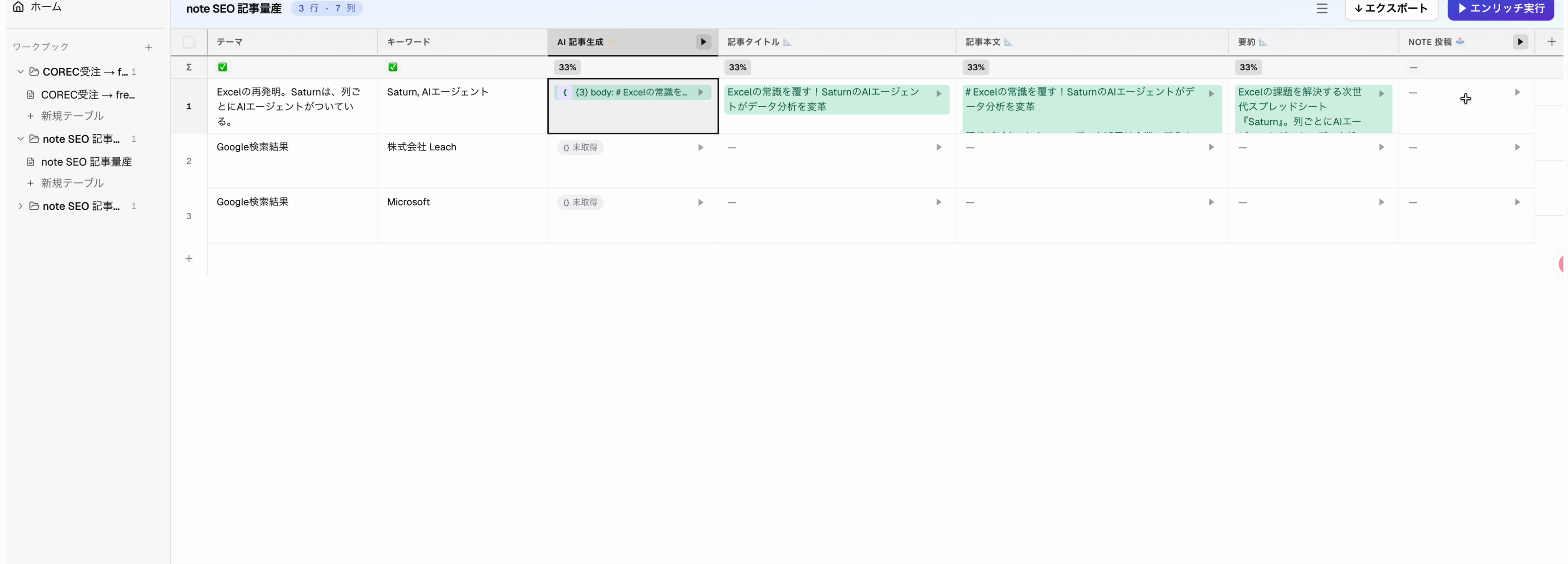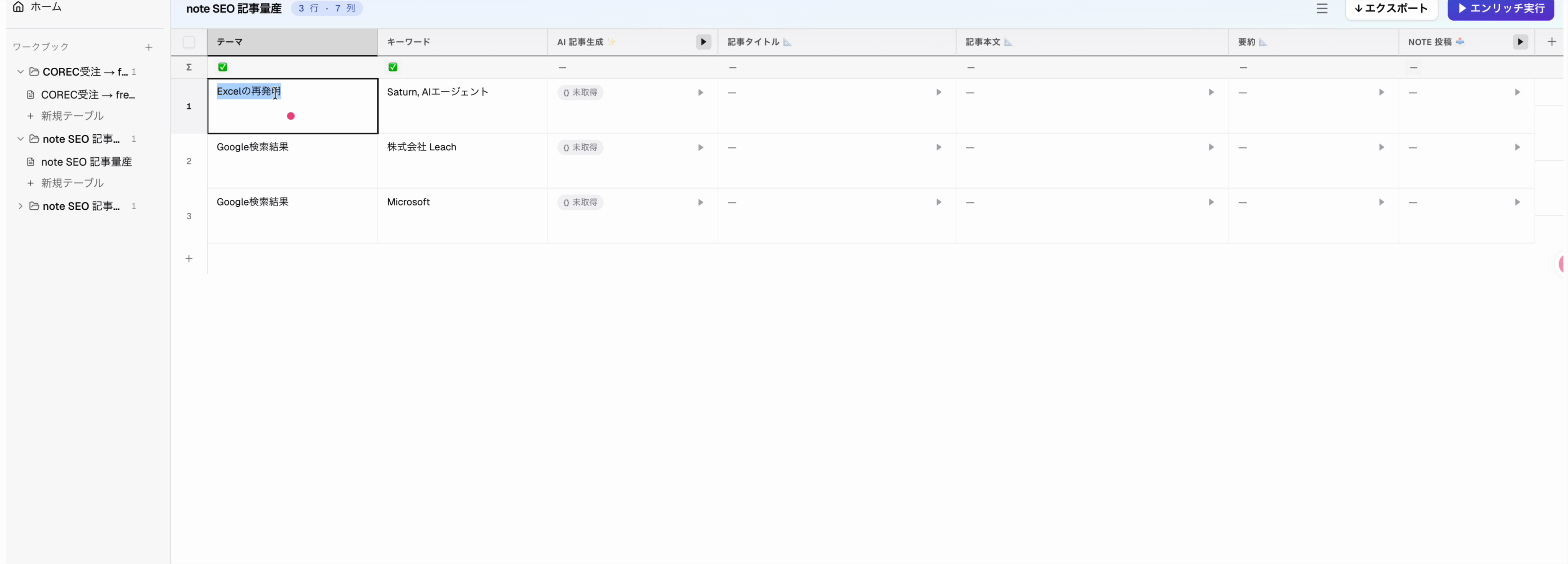 キーワードを入力するだけで、AI が SEO に最適化された記事を自動生成し、note に一括投稿します。コンテンツマーケティングの記事量産を自動化できます。