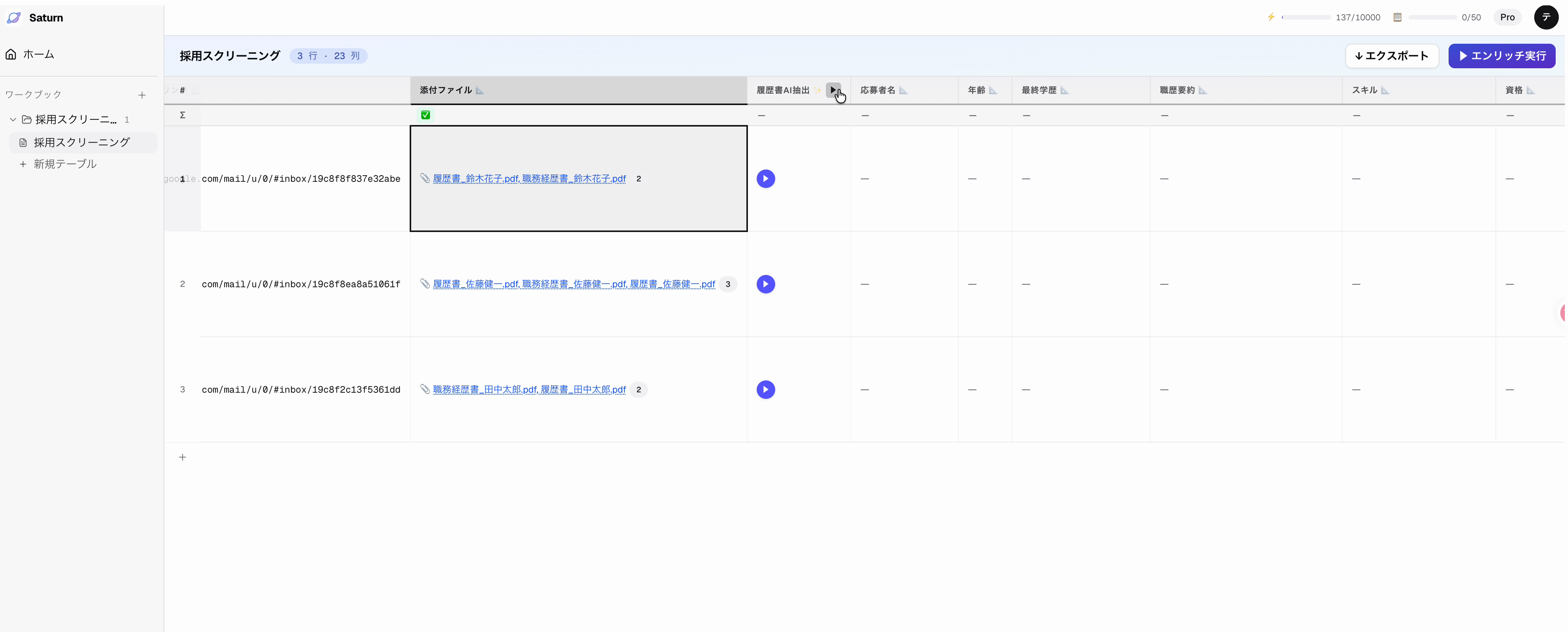 応募メールが行として取り込まれる。添付ファイル(履歴書・職務経歴書 PDF)も自動で取得される。