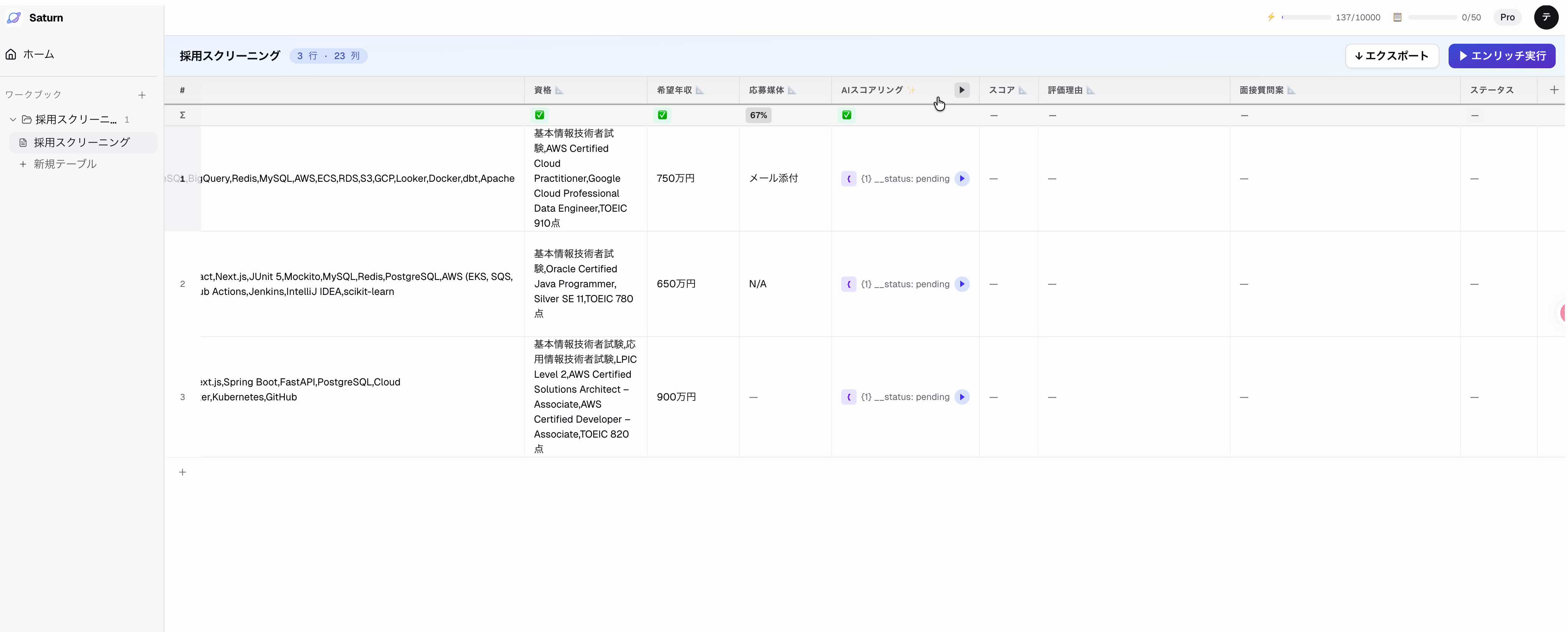 | スコアリング | AIスコアリング / スコア / 評価理由 / 面接質問案 | AI が候補者を S/A/B/C でスコアリング |