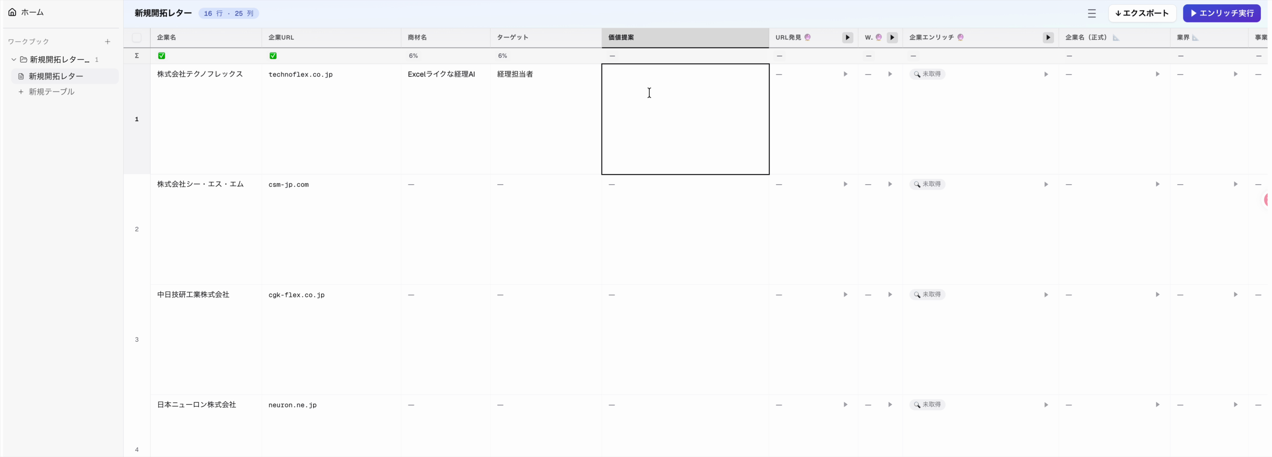 | 商材情報 | 商材名 / ターゲット / 価値提案 | 自社の商材情報(全行共通 or 行ごとにカスタム) |