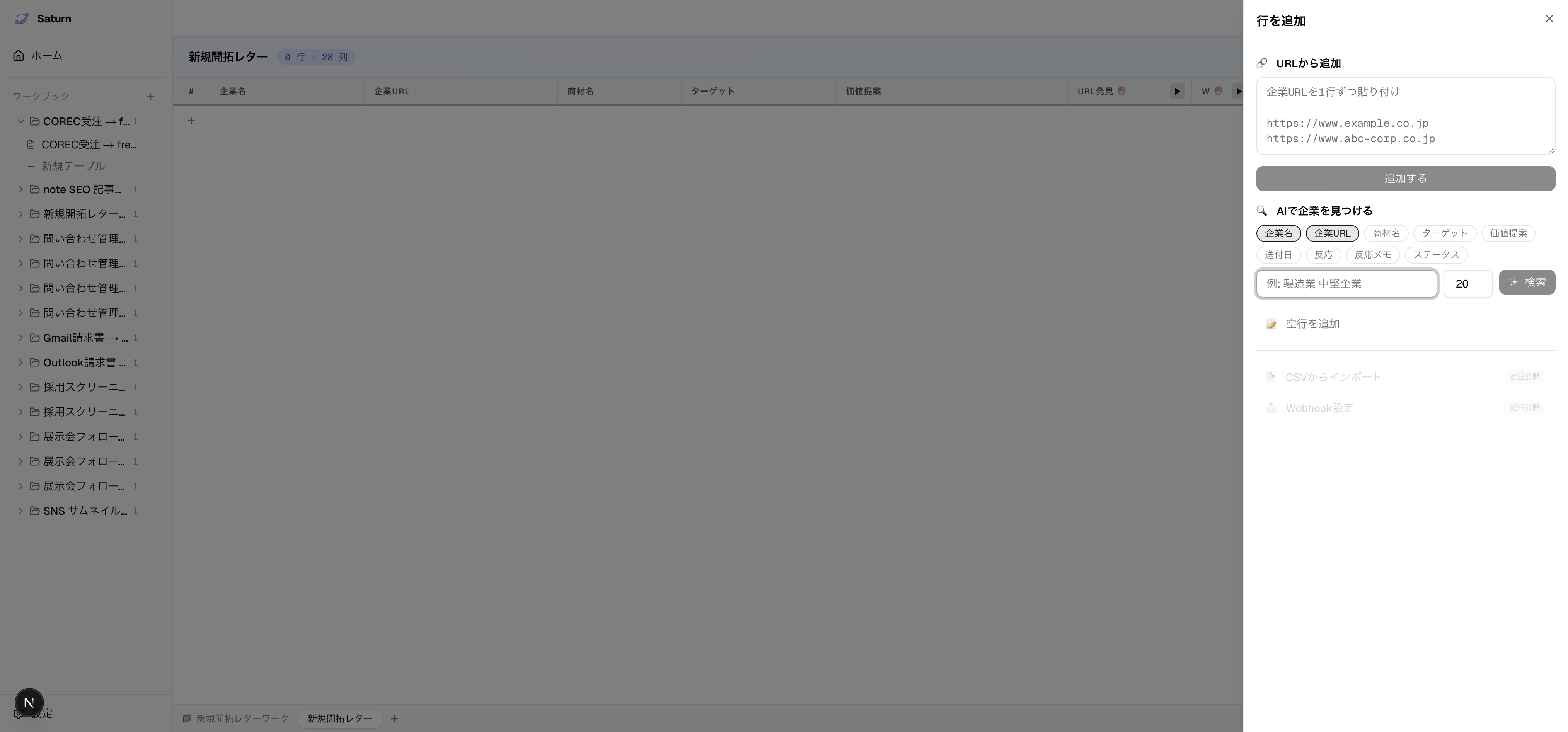 方法 説明 手入力 企業名と URL を 1 行ずつ入力 CSV 一括入力 CSV ファイルからまとめて取り込み AI で候補を生成 テーマ(例:「渋谷区の IT 企業」)を入力して AI がリストを自動生成 -