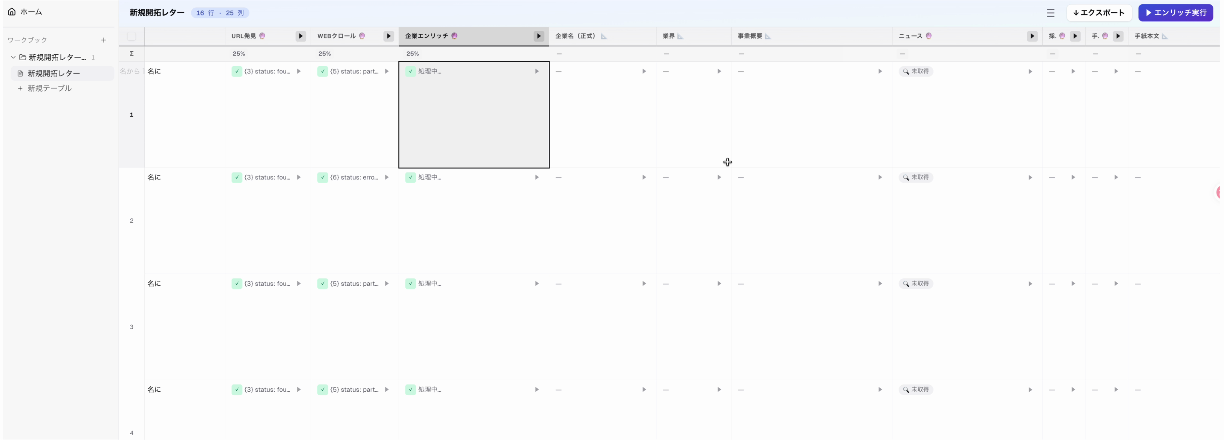 | 企業情報 | 企業エンリッチ / 企業名(正式)/ 業界 / 事業概要 | 企業の詳細情報を構造化抽出 |