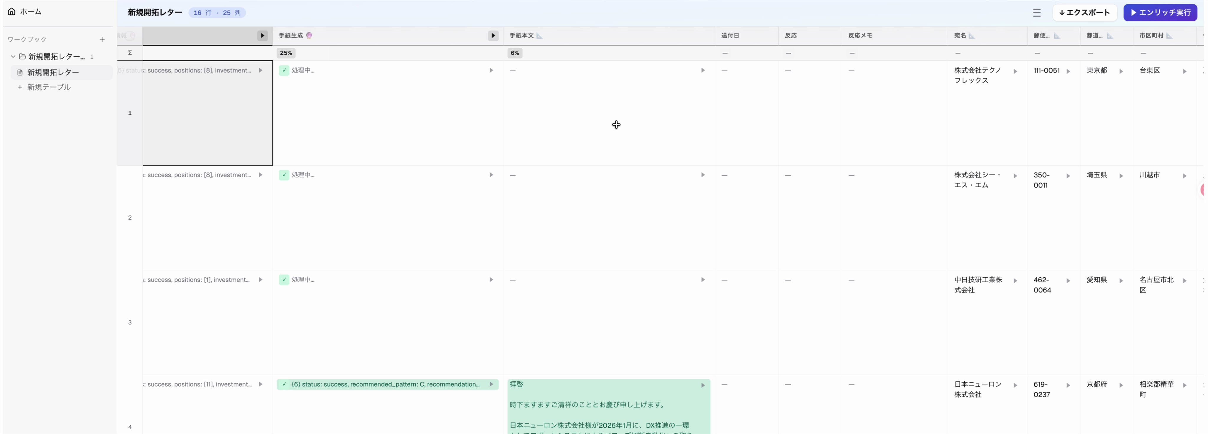 レイヤー 処理内容 1 URL発見(企業名 → 公式サイトURL) 2 Webクロール + ニュース検索(URLからデータ取得) 3 企業エンリッチ + 採用情報(構造化抽出) 4 親和性分析(商材 × 企業の相性をスコアリング) 5 手紙生成(全情報を基に AI が手紙を作成) -